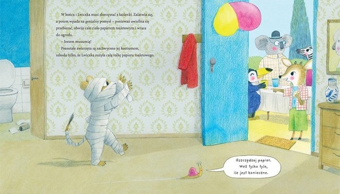 Do lekkiej opowieści o urodzinach autorka zręcznie wplata kilka zasad korzystania z łazienki. Maluchy dowiedzą się z książki, że nie warto czekać do ostatniej chwili z pójściem do toalety (nawet jeśli akurat świetnie się bawią). Zobaczą, dlaczego trzeba pukać przed wejściem oraz usłyszą że należy oszczędzać papier toaletowy (bo może zabraknąć go dla innych). Innymi słowy: poznają wiele cennych wskazówek na temat higieny i używania wspólnej przestrzeni łazienkowej. A wszystko to podczas czytania historii wziętej prosto z życia. Oto poradnik jakiego jeszcze nie było!